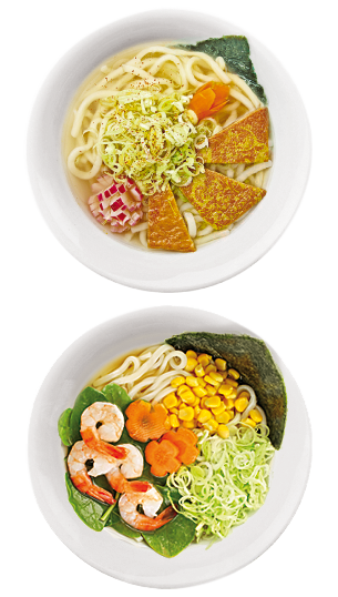 Die Alternative zu Ramen: Wählen Sie zwischen zwei typischen japanischen Nudelsorten, serviert an einer milden Dashi-Brühe.