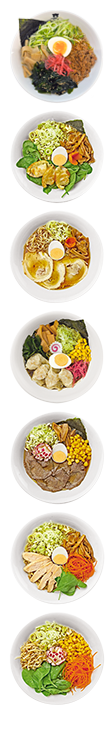 Frische japanische Nudeln mit feinen Einlagen an einer würzigen, hausgemachten Suppe – das sind unsere Ramen. Wählen Sie zuerst die Suppe, dann den Inhalt.